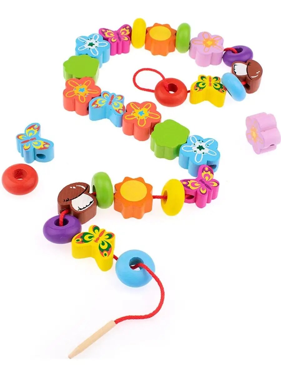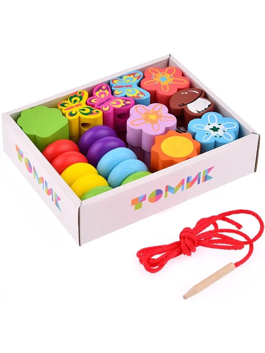 Развивающая игра "Полянка" Томик, 13 деревянных деталей, шнуровка, бусы