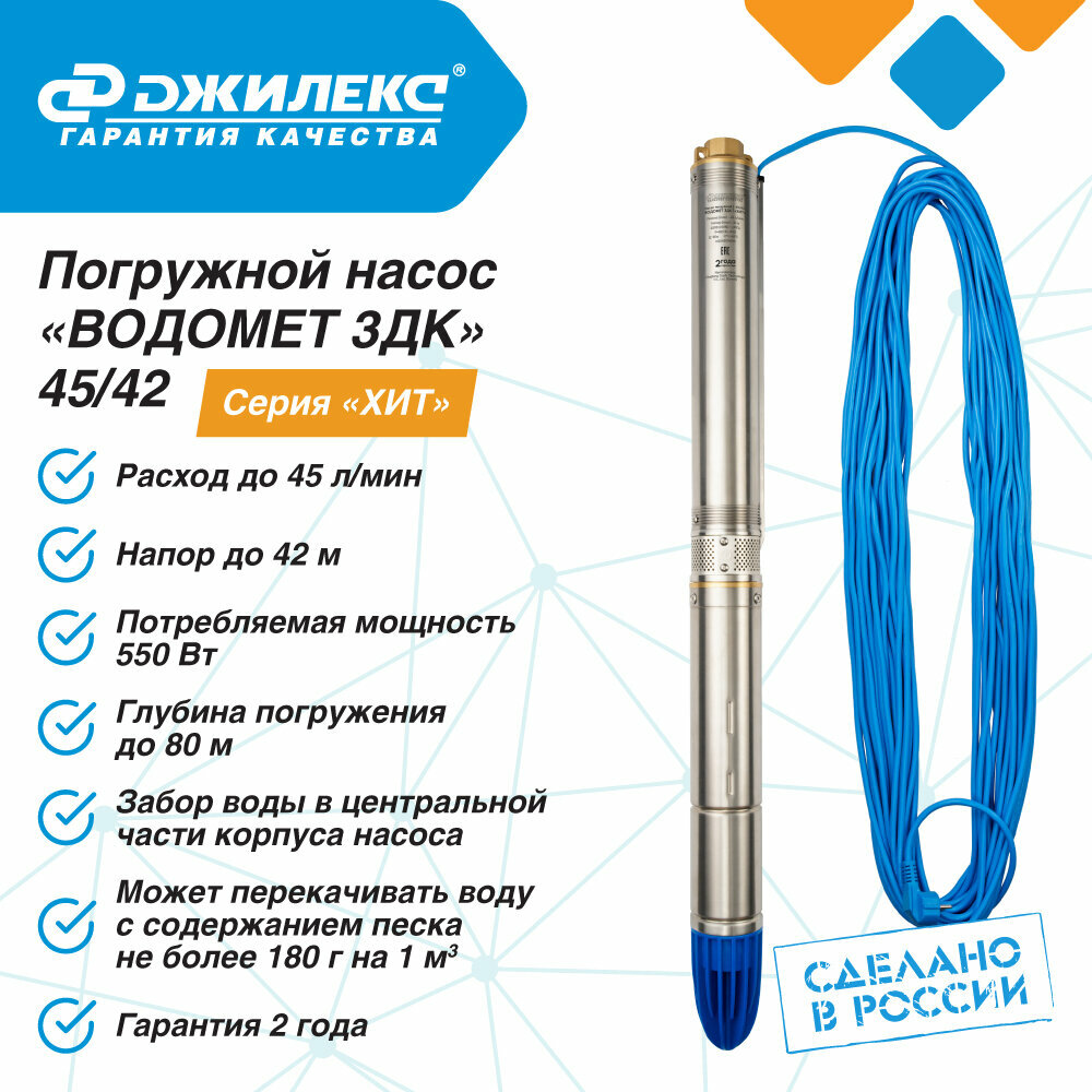 СохранитьДЖИЛЕКС Насос погружной скважинный ДЖИЛЕКС водомет ЗДК 45/42, 45 л/мин, Н-42 м, d-76 мм, каб. 20 м. Насос для скважин центробежный интересное: