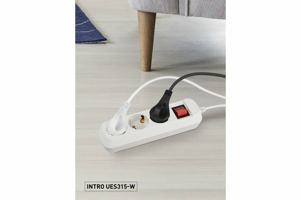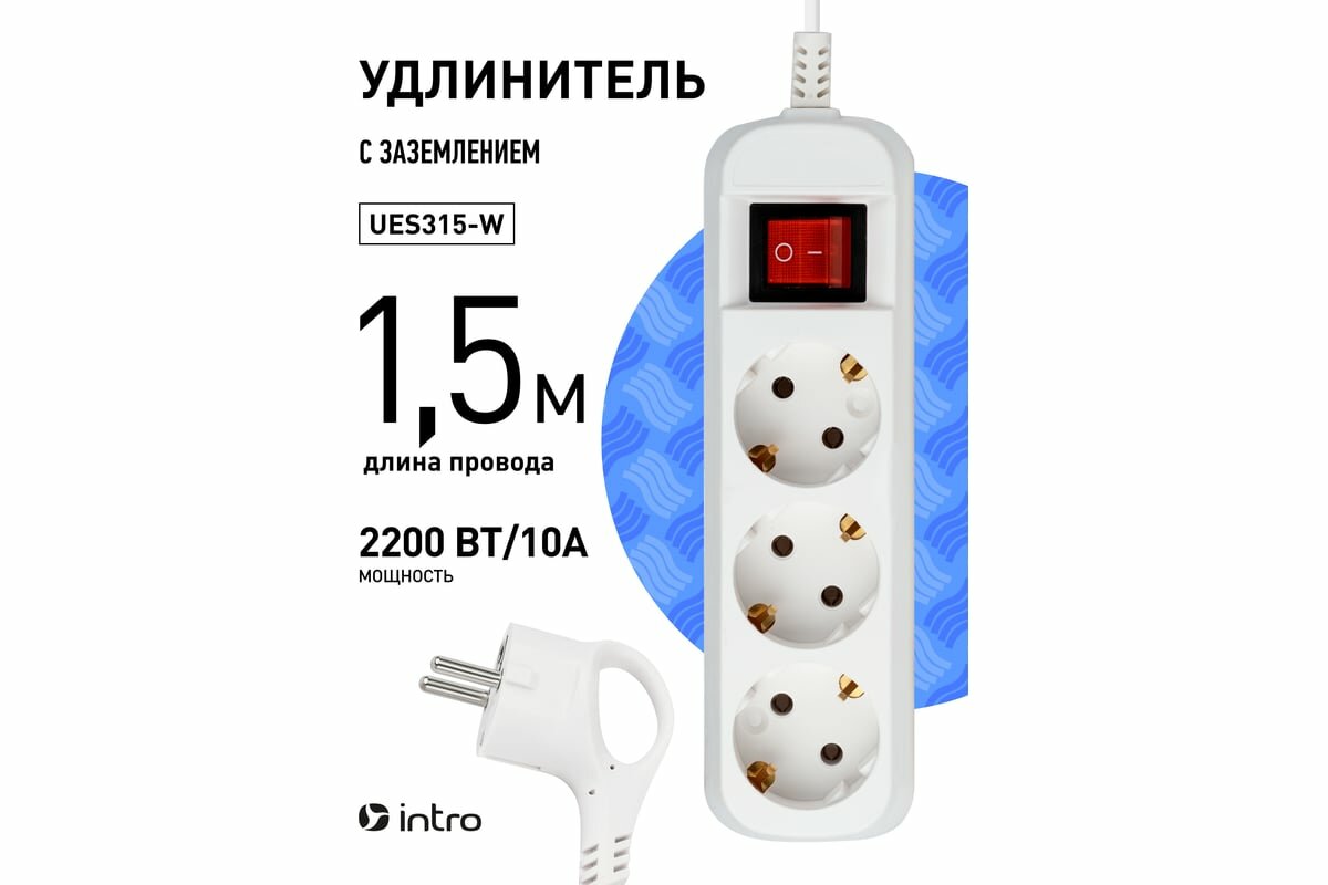 Удлинитель Intro UES315-W сетевой электрический бытовой с заземлением с выключателем 3 розетки, 1,5 м, ПВС 3х0,75мм2, 10А, белый