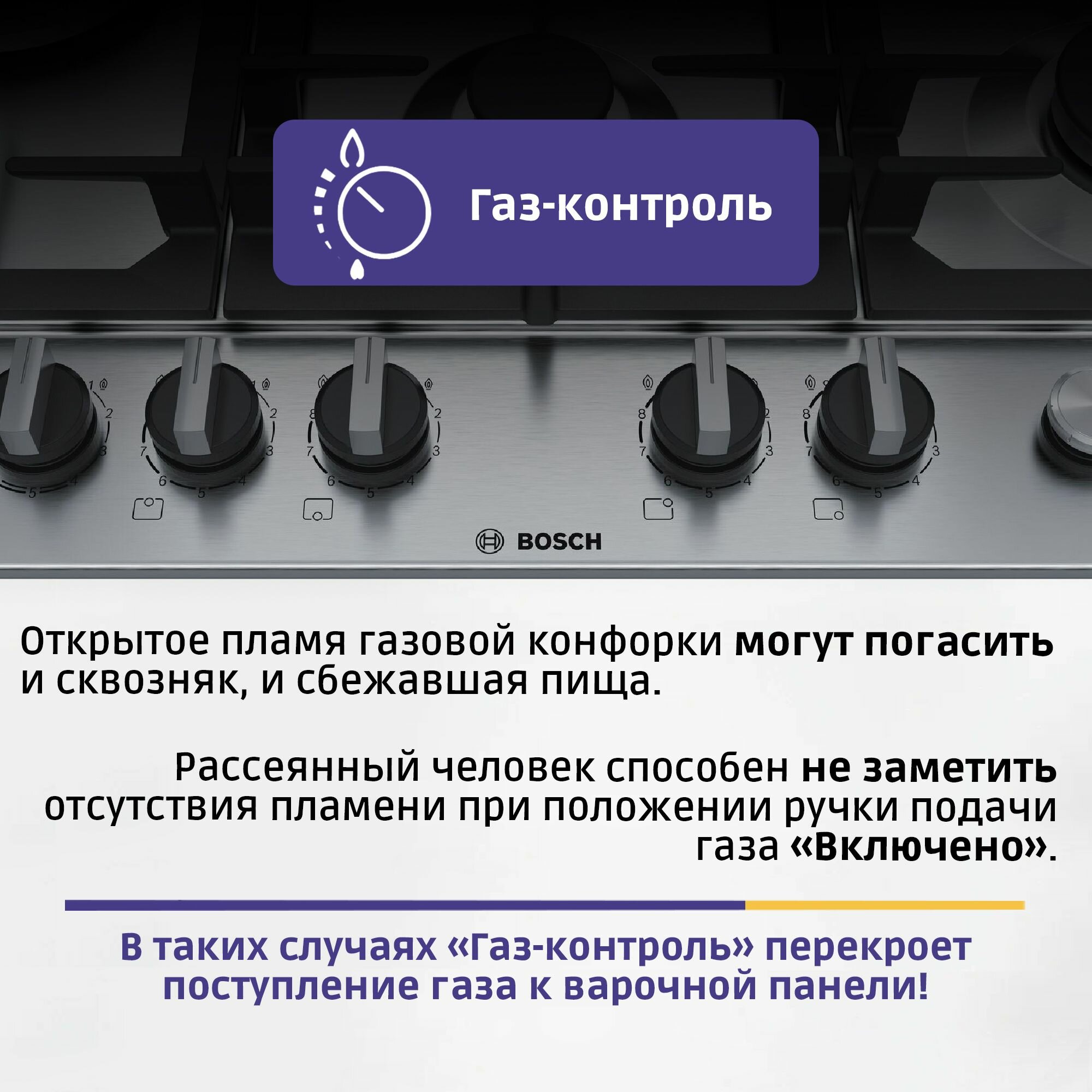 СохранитьВарочная панель газовая Bosch PCS7A5M90, конфорок - 5 шт, электроподжиг, газ-контроль, серебристый интересное: