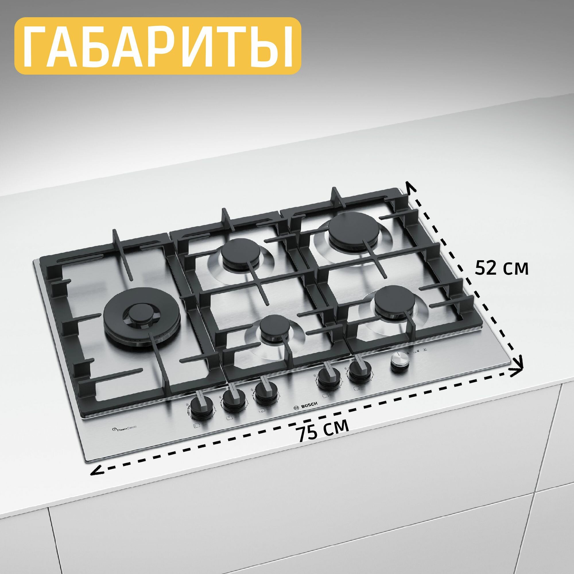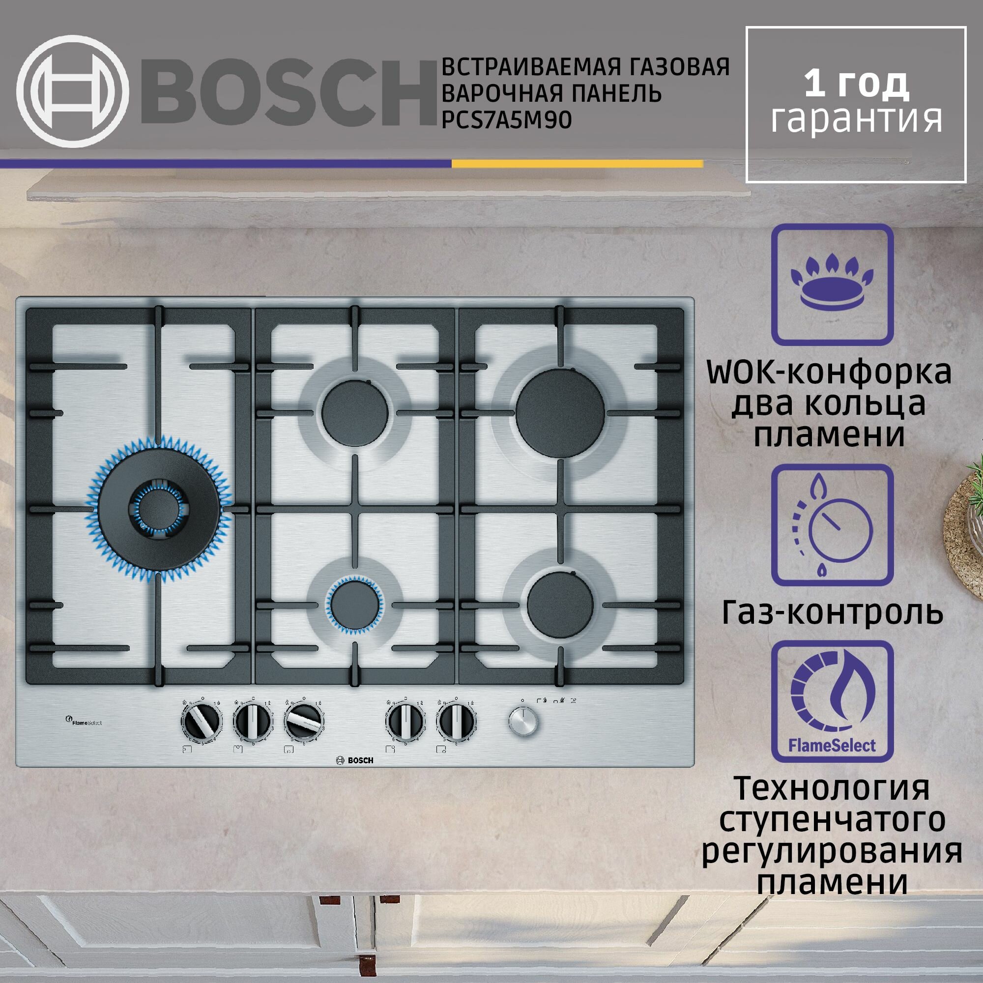 Купить Варочная панель газовая Bosch PCS7A5M90, конфорок - 5 шт, электроподжиг, газ-контроль, серебристый