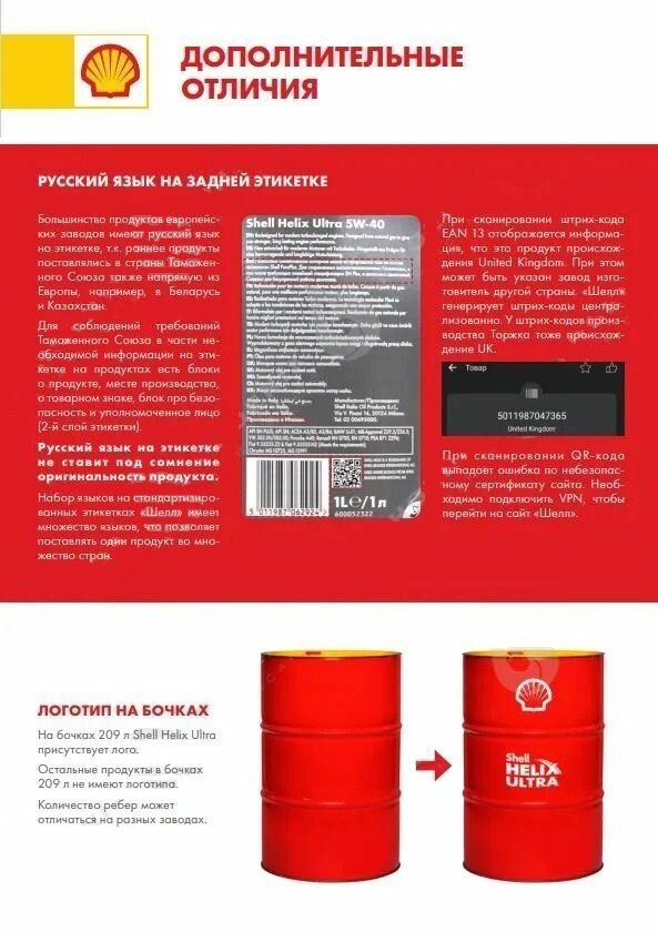 | Дополнительная информация | Компания SHELL в мае 2022 года продала весь свой бизнес компании Лукойл. Начиная с указанной даты SHELL перестал поддерживать систему проверки подлинности. Этот факт подтверждается если перейти на сайт проверки, указанный на проверочной этикетке - http://ac.shell.com/index.aspx |