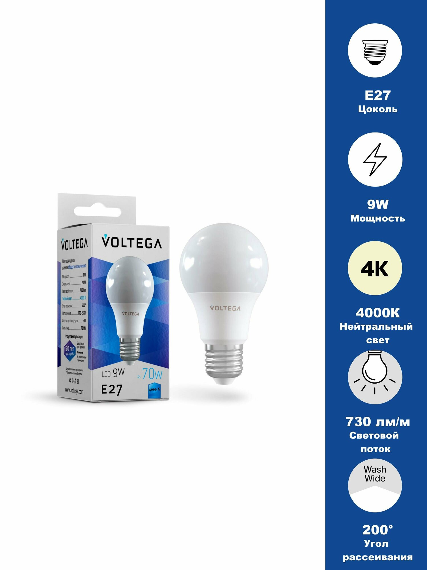 Купить Лампочка светодиодная E27 форма груша 9W нейтральный белый Voltega Simple A60 4000K 1 штука