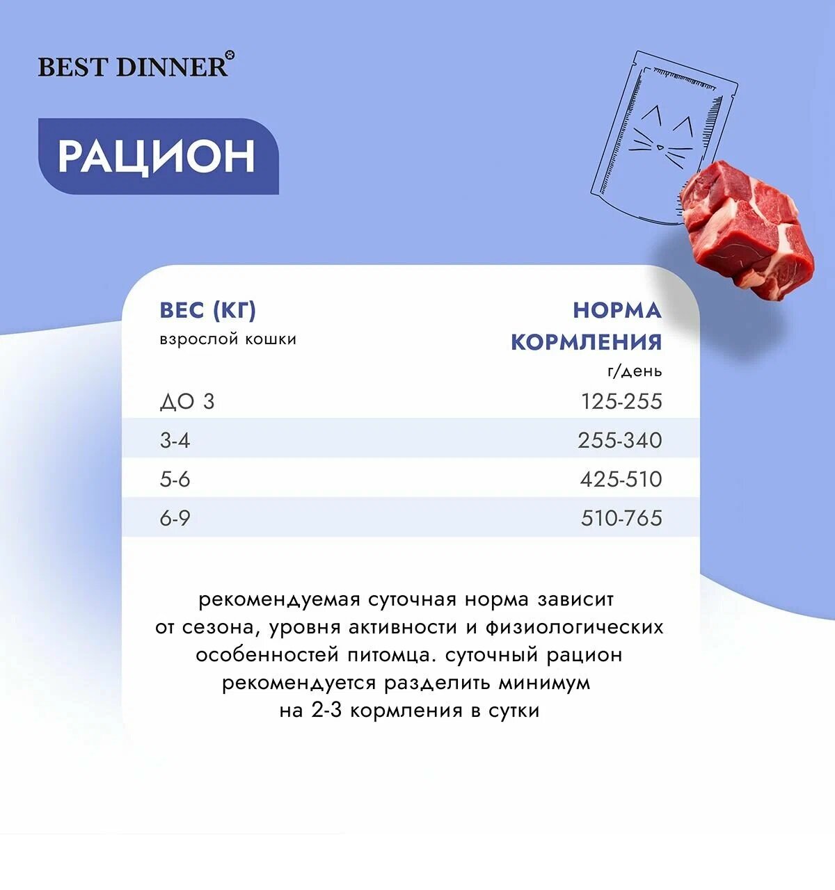 | Дозировка | Норма потребления корма для кошек 30-50 г на кг веса животного в 2 приема кормления. Норма потребления корма для котят 40-60 г на кг веса животного в 2-3 приема кормления |