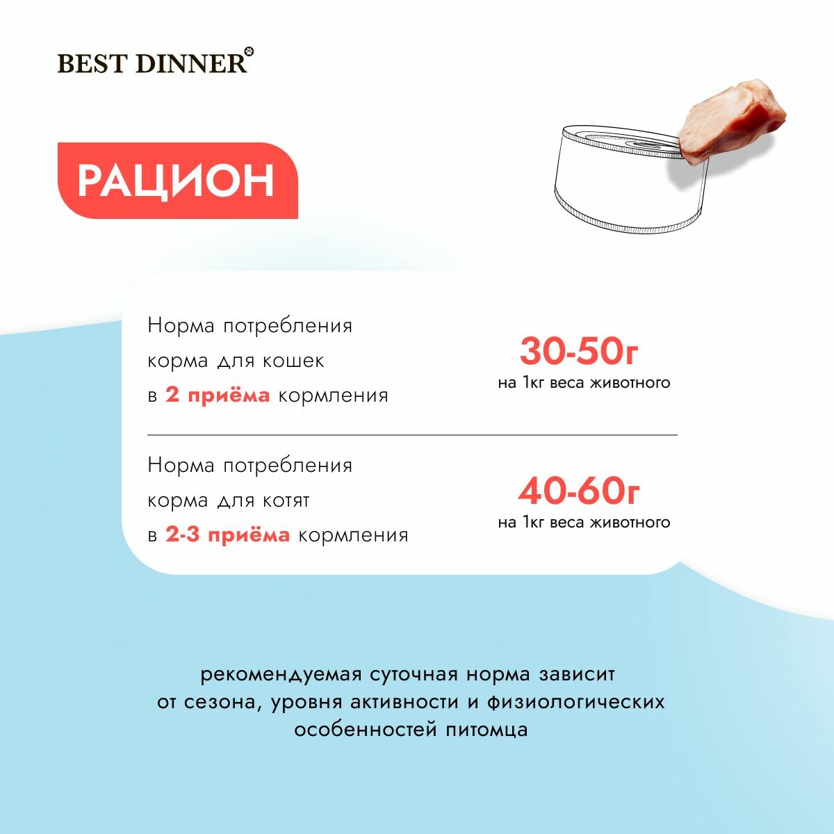 | Дозировка | Норма потребления корма для кошек 30-50 г на кг веса животного в 2 приема кормления. Норма потребления корма для котят 40-60 г на кг веса животного в 2-3 приема кормления |