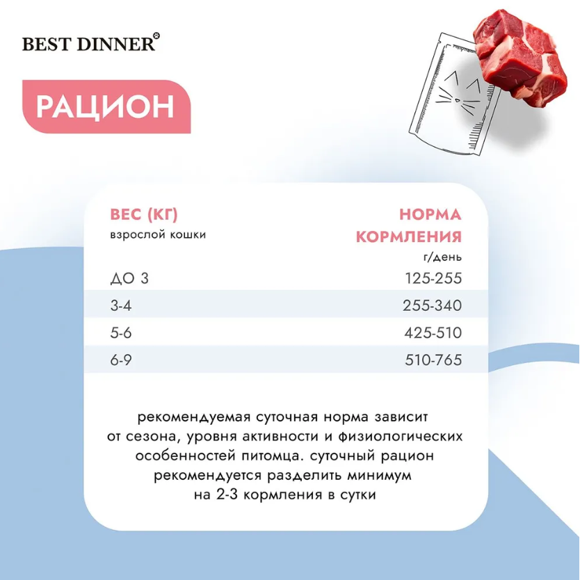| Дозировка | Норма потребления корма для кошек 30-50 г на кг веса животного в 2 приема кормления. Норма потребления корма для котят 40-60 г на кг веса животного в 2-3 приема кормления |