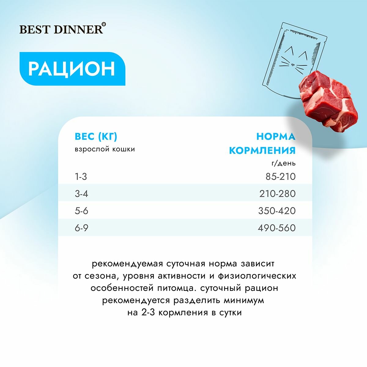 | Дозировка | Норма потребления корма для кошек 30-50 г на кг веса животного в 2 приема кормления. Норма потребления корма для котят 40-60 г на кг веса животного в 2-3 приема кормления |