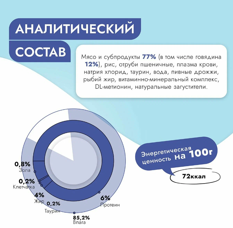 | Состав | говядина, таурин, желирующая добавка, соль, вода питьевая |