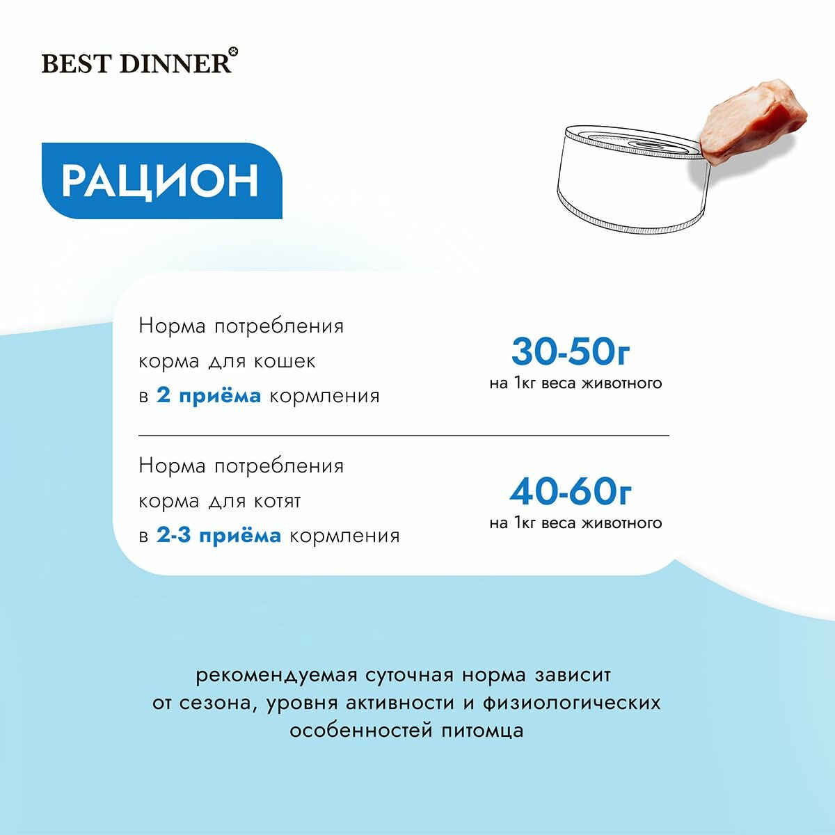 | Дозировка | Норма потребления корма для кошек 30-50 г на кг веса животного в 2 приема кормления. Норма потребления корма для котят 40-60 г на кг веса животного в 2-3 приема кормления |