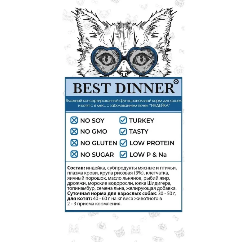 СохранитьВлажный диетический корм Best Dinner VET PROFI Renal для кошек при заболевании почек с индейкой и рисом (12шт х 100гр) интересное: