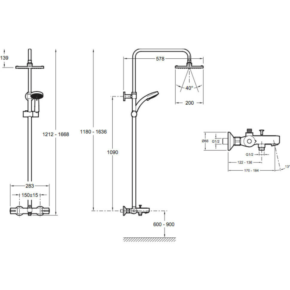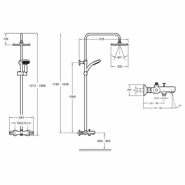 | Дополнительная информация | высота стойки для душа: 1668 мм; диаметр душевой лейки: 90 мм; размеры верхнего душа: 200х200 мм; с ограничением температуры воды |