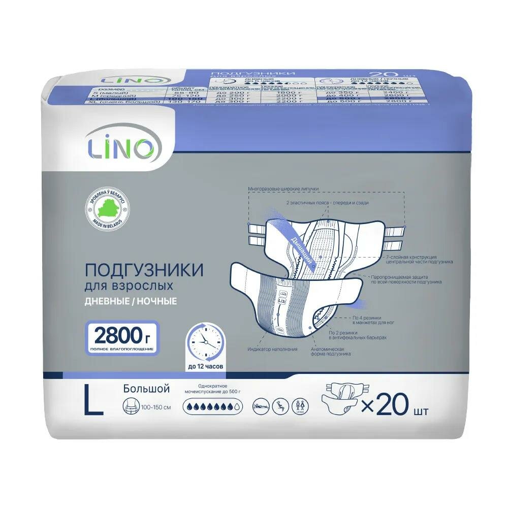 Подгузники для взрослых. LINO, L (Large), 2800 мл, п/э мяг. уп. 20 шт., арт. 15.3.1.20.1