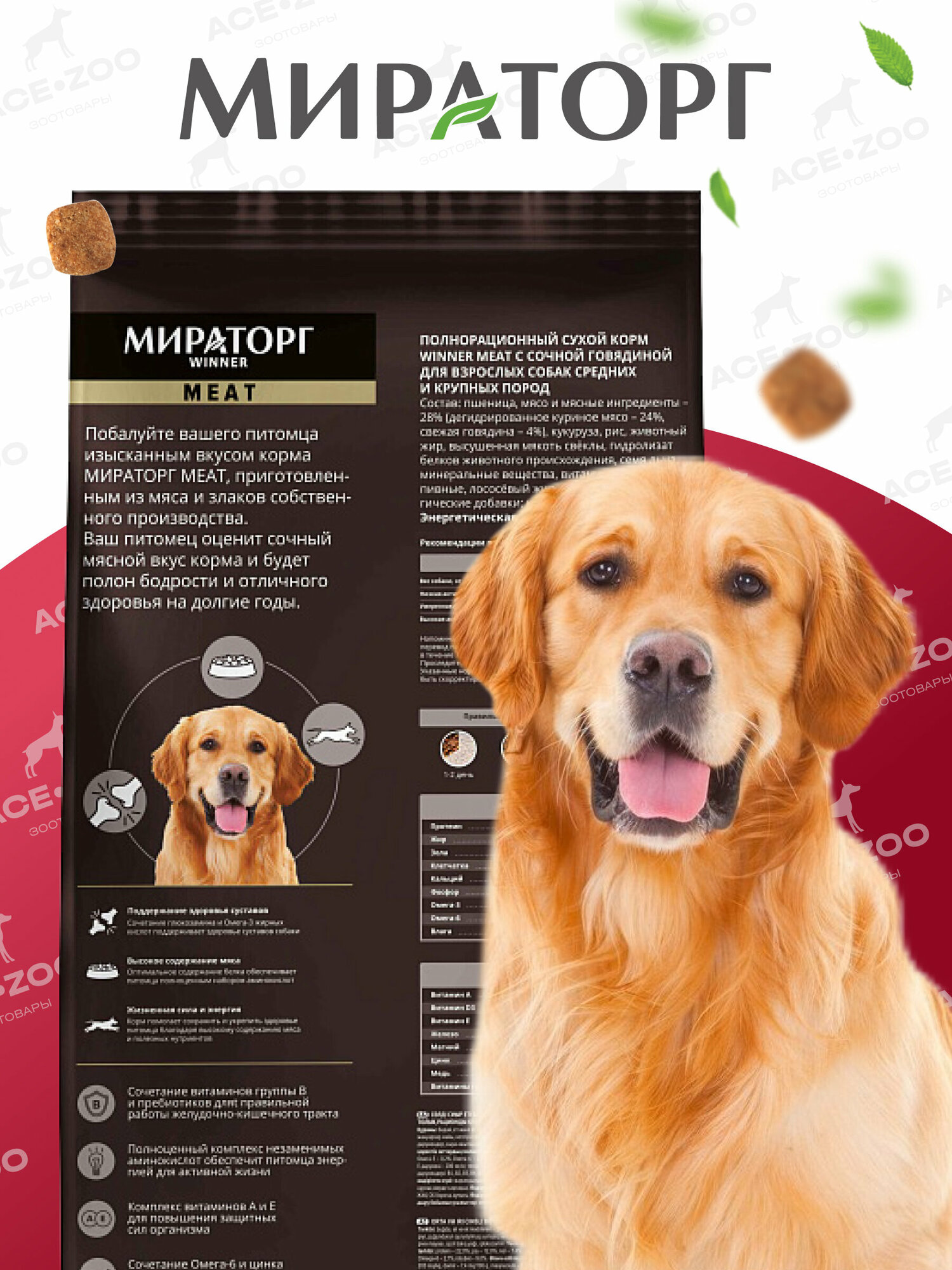 Сухой корм мираторг MEAT для взрослых собак средних и крупных пород с сочной говядиной (10 + 10 кг)