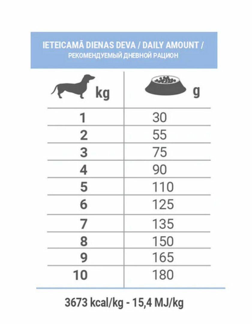 | Пищевая ценность | влажность — 8.0%, сырой белок — 28.0%, сырые жиры и масла — 14.0%, сырая клетчатка — 2.4%, сырая зола — 7.5%, кальций — 1.4%, фосфор — 1.0%, Омега-3 — 0.8%, Oмега-6 — 2.4% |