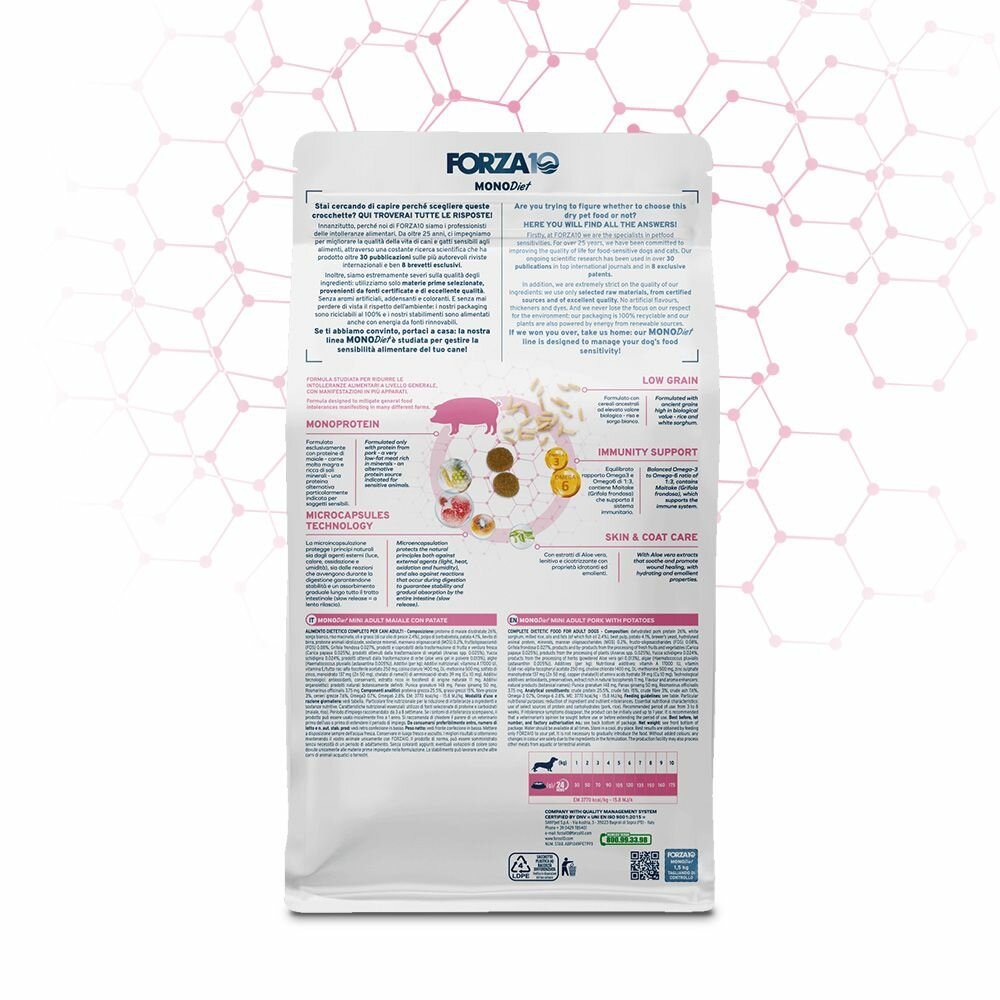 FORZA10 DOG MINI MONODIET LOW GRAIN монобелковый для взрослых собак маленьких пород при аллергии со свининой и картофелем (1,5 кг)