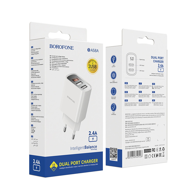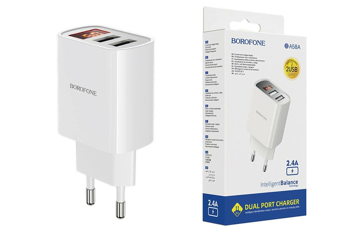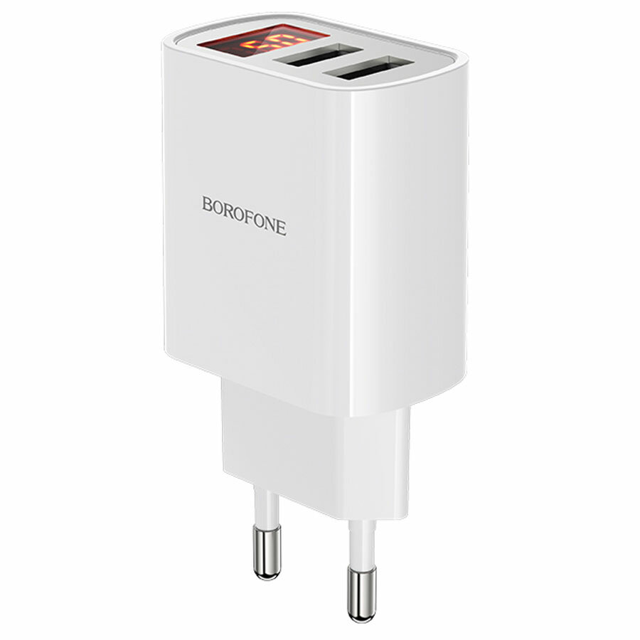 Сетевое зарядное устройство c двумя USB, Borofone, BA58A, с дисплеем, отображение тока и напряжения, 2,4A, белое
