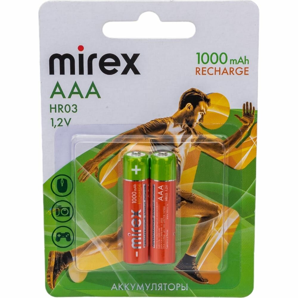 Аккумуляторы Mirex HR03 / AAА 1000 mAh / аккумуляторные батарейки мизинчиковые, Ni-Mh, 2 шт. в упаковке