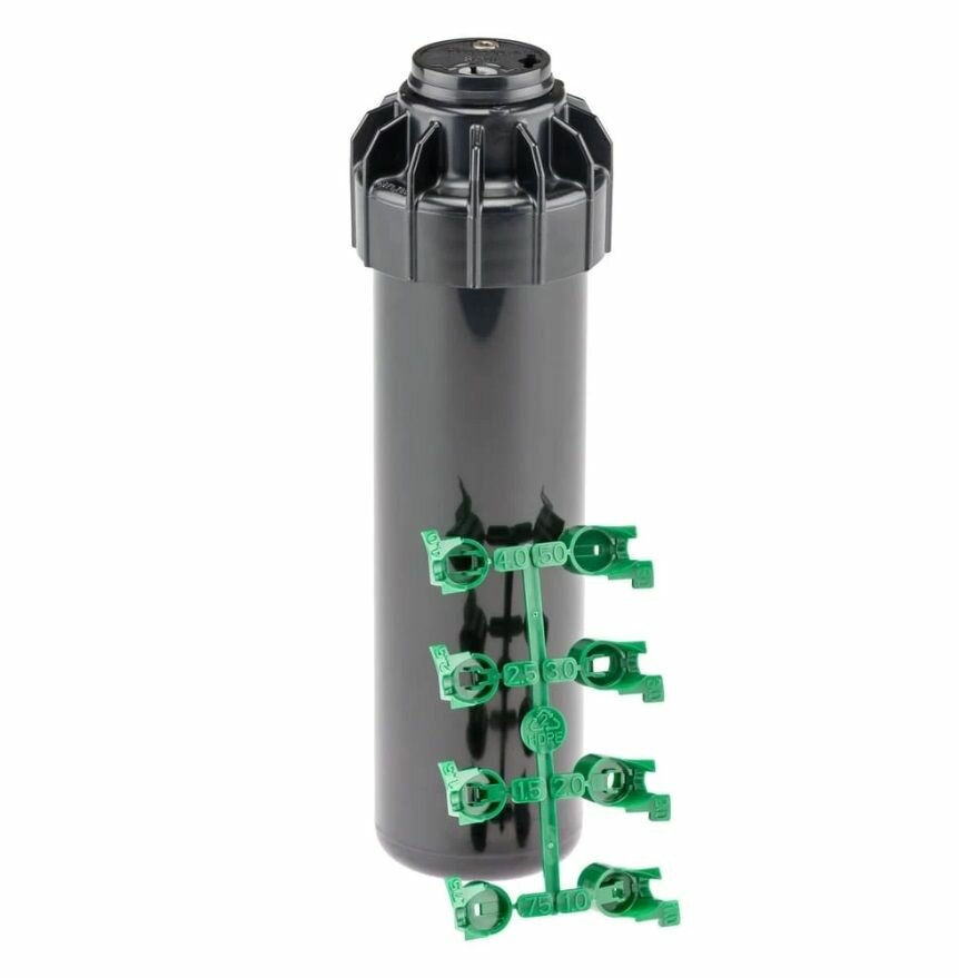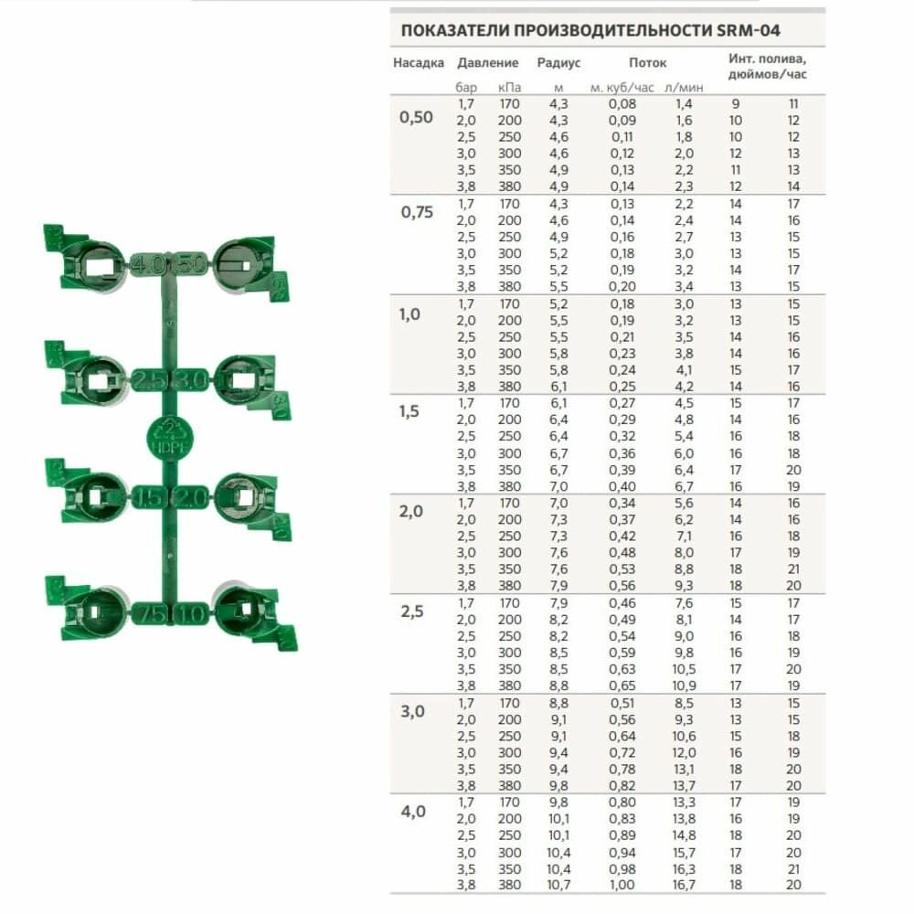 | Дополнительная информация | угол наклона сопла: приблизительно 18º; рабочее давление 1,4 – 7 бар; рекомендуемое давление 1,7 – 3,8 бар; расход 1,4 – 13,7 л/мин; радиус полива 4,0 – 9,4 м; общая высота дождевателя 17 cм; диаметр штанги 3 cм |