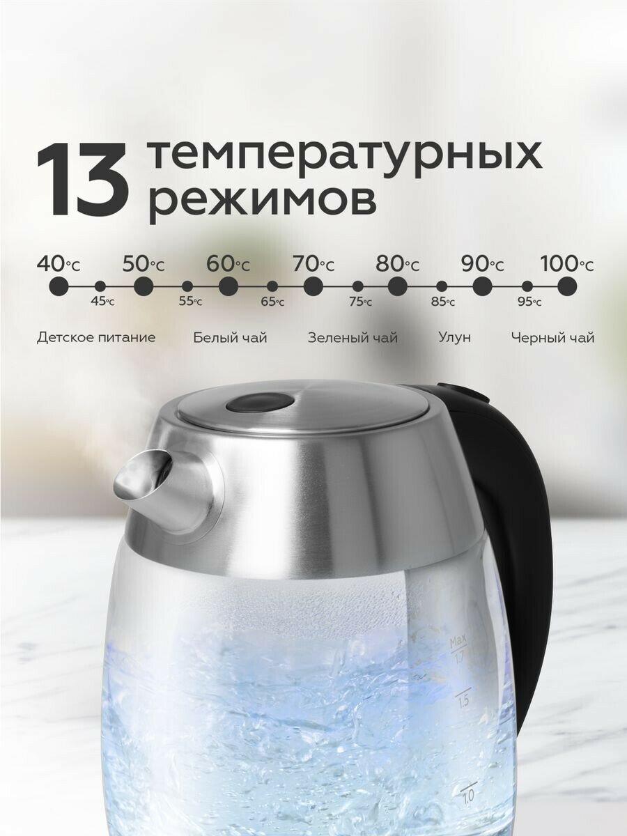 Чайник электрический BQ KT1703G, стекло, 1.7 л, 2200 Вт, чёрно-серебристый