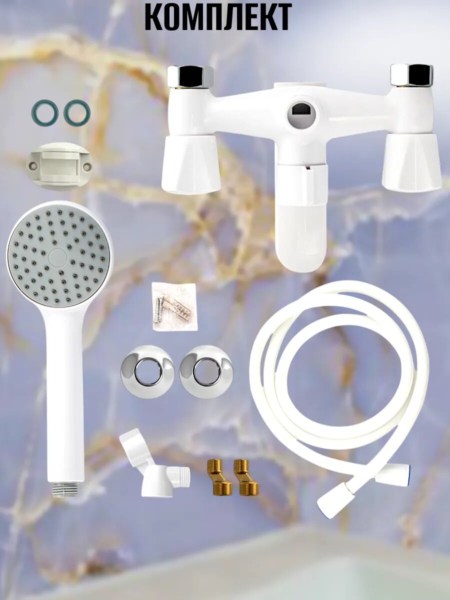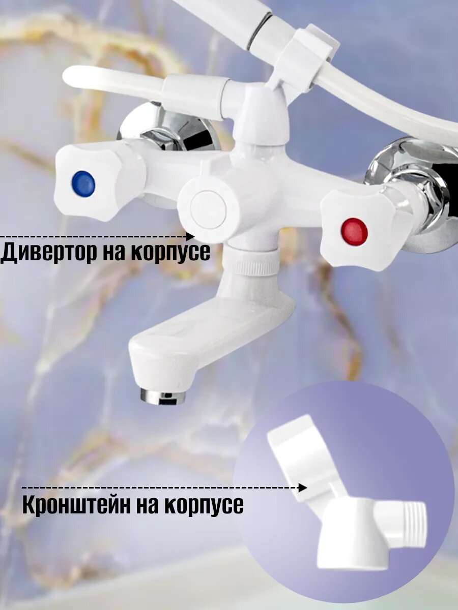 Смеситель в ванную длинный излив с дивертором, шаровый из высокопрочного пластика АБС - БЕЛЫЙ