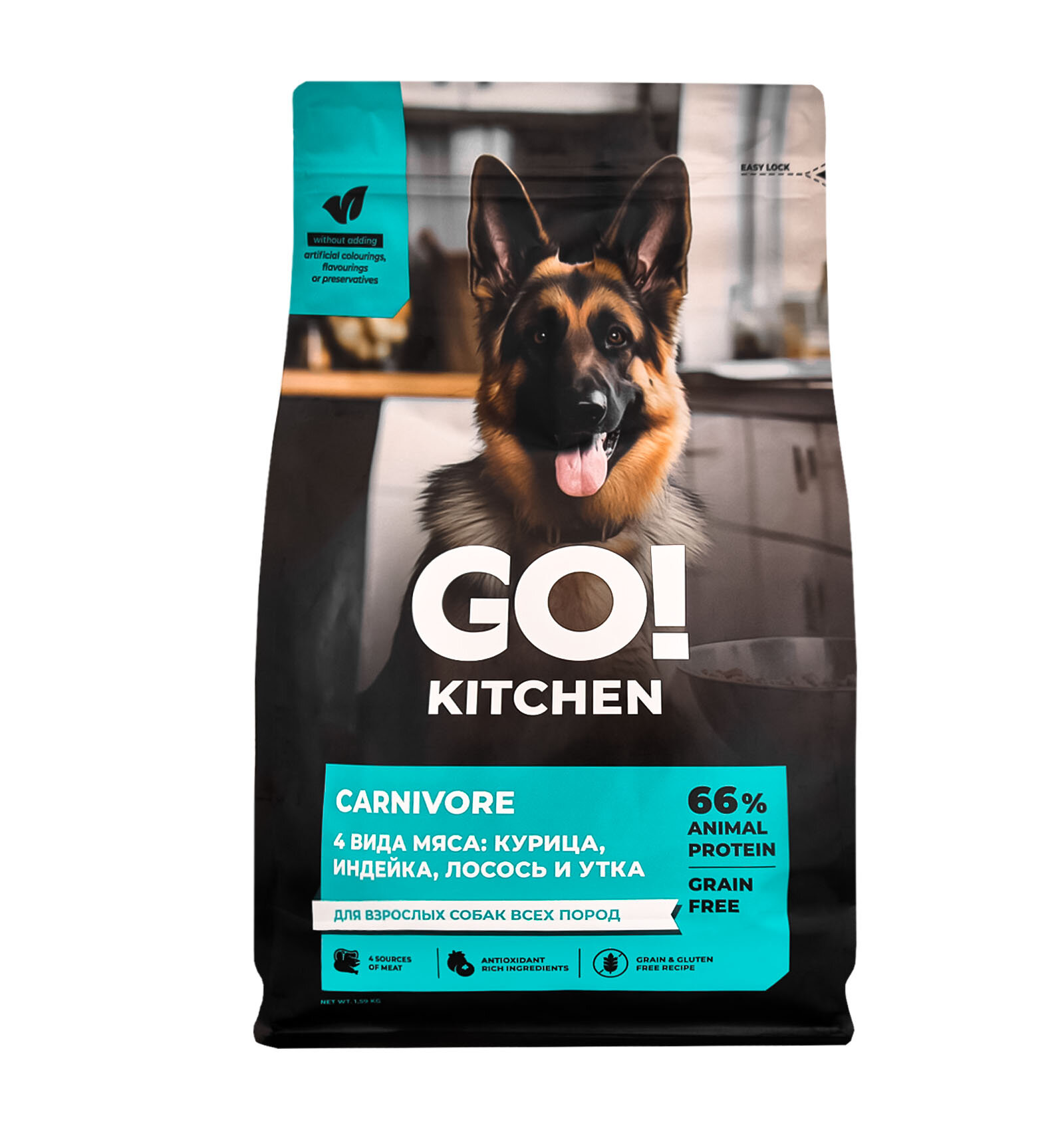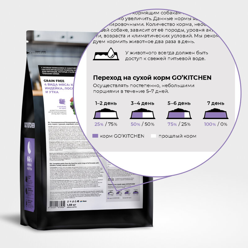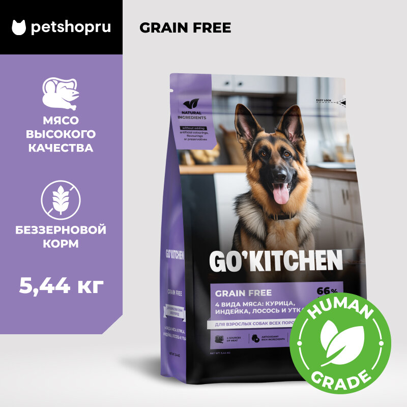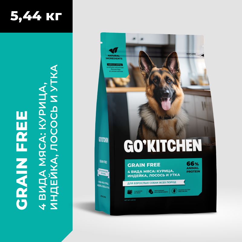 СохранитьGO'KITCHEN беззерновой корм для взрослых собак всех пород с курицей, индейкой, лососем и уткой, GRAIN FREE ADULT 4 Meat Recipe, 5,44 кг интересное: