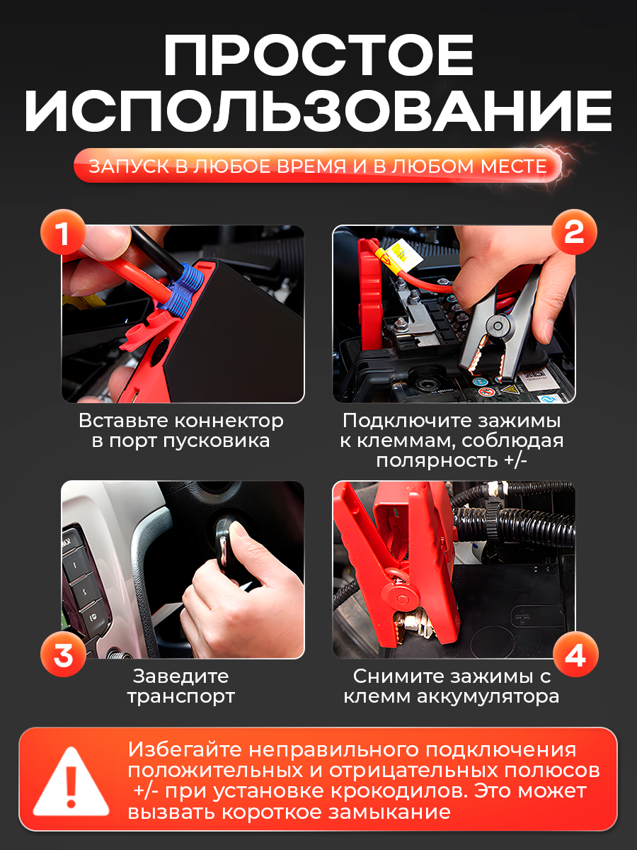 | Комплектация | Пусковое устройство, усиленные зажимы(крокодилы), USB кабель с коннекторами Type-C, USB, MicroUSB, Lightning, блок питания,кейс для переноски |