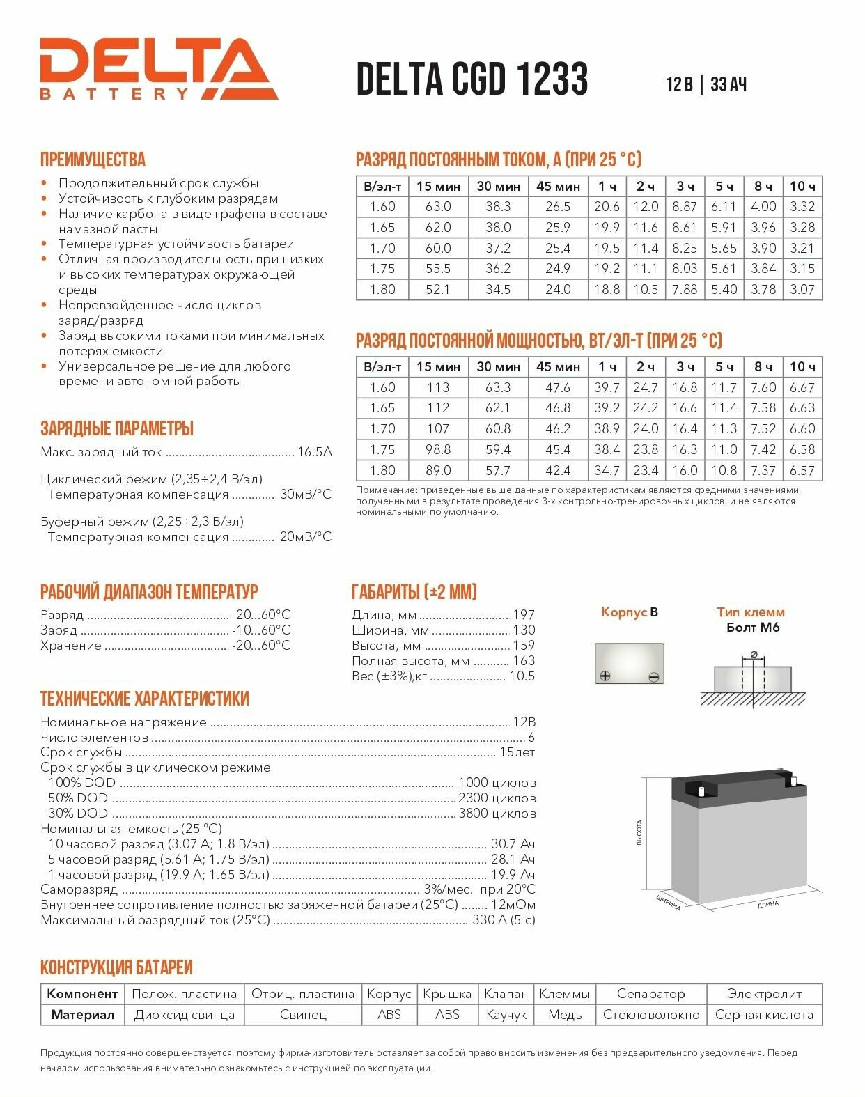 Аккумулятор DELTA CGD 1233 (12В, 33Ач / 12V, 33Ah / вывод под болт M6) карбон