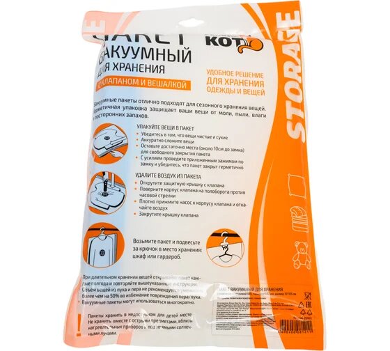 Вакуумный пакет для хранения одежды с клапаном и вешалкой "Рыжий Кот" VB5, 70 х 105 см
