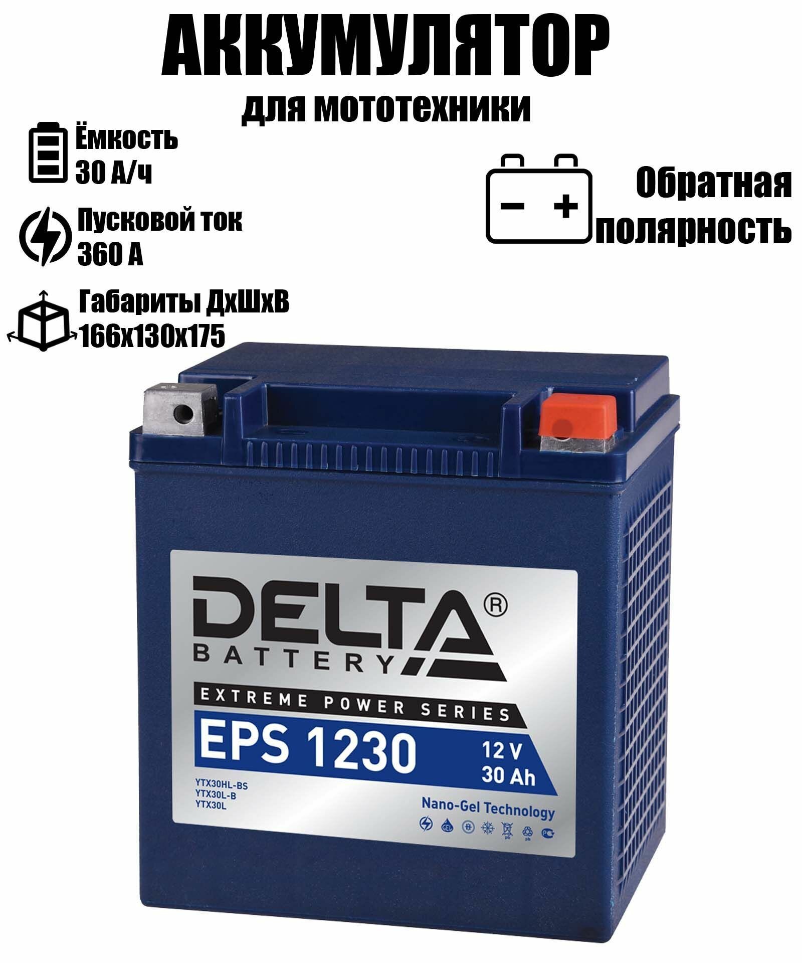 Мото Delta 12В 30Ач (Ytx30hl-Bs, Ytx30l-B, Ytx30l) О/П Д*Ш*В 16,6*13,0*17,5 См Арт. Eps 1230 Delta арт. EPS1230