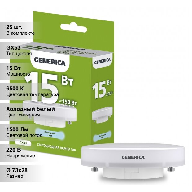 (12 шт.) Светодиодная лампочка GENERICA LED T80 таблетка, мощность 15 Вт, напряжение питания 220 В, цветовая температура 6500 К, Холодный белый свет, цоколь GX53, размер 73х28 мм