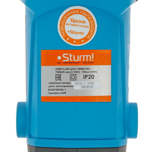 AG95151P Машина углошлифовальная "профи" 150мм,1400Вт,7500об/мин,удлин.рук,повыш.пылезащ,Sturm! Sturm!
