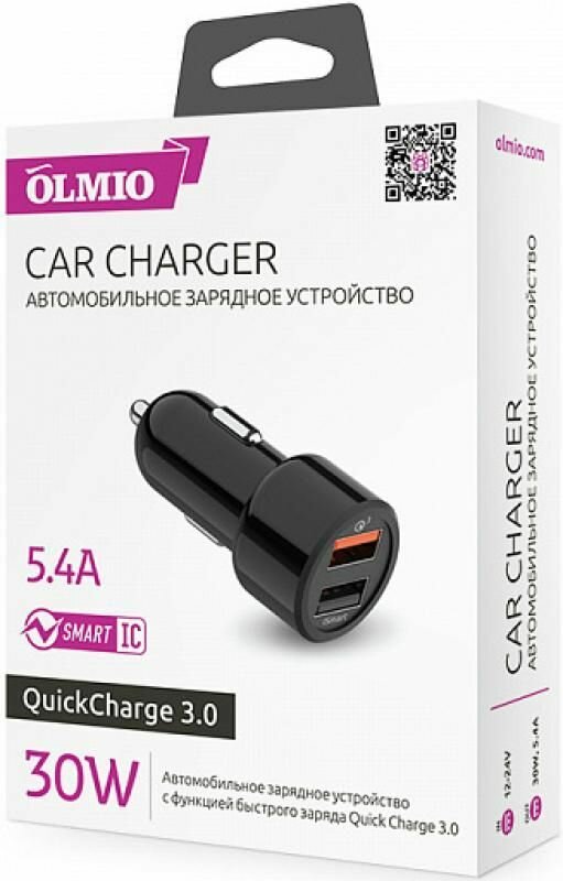 Устройство зарядное OLM-038718 в прикуриватель, 1USB 5,4 + Quick Charge 3.0, 30W черный OLMIO