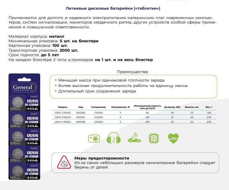 СохранитьGeneral, Батарейка ,Количество 5 шт, Химический тип Литиевый, Форм-фактор CR2032 интересное: