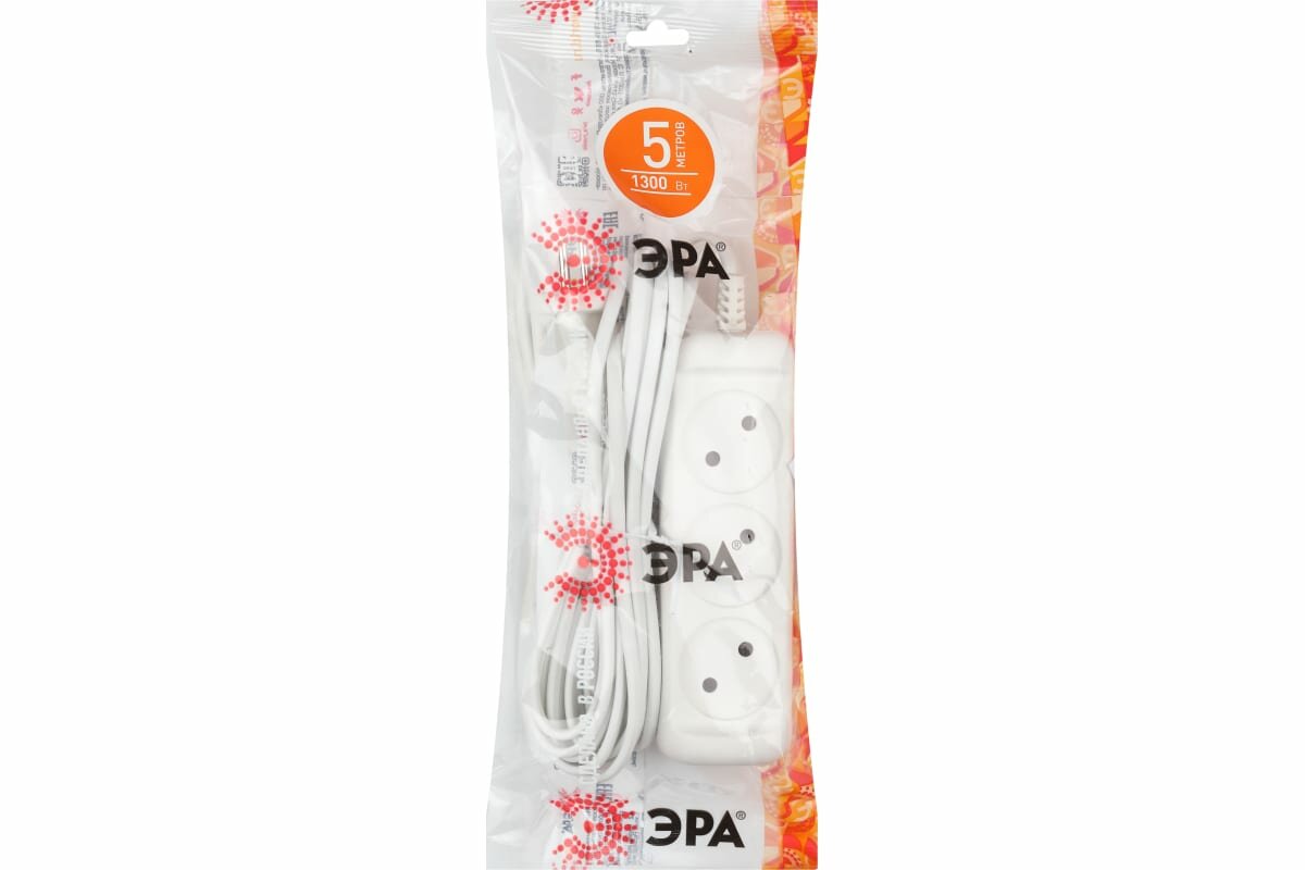 Удлинитель без заземл., 1300Вт, 3гн, 5м Эра
