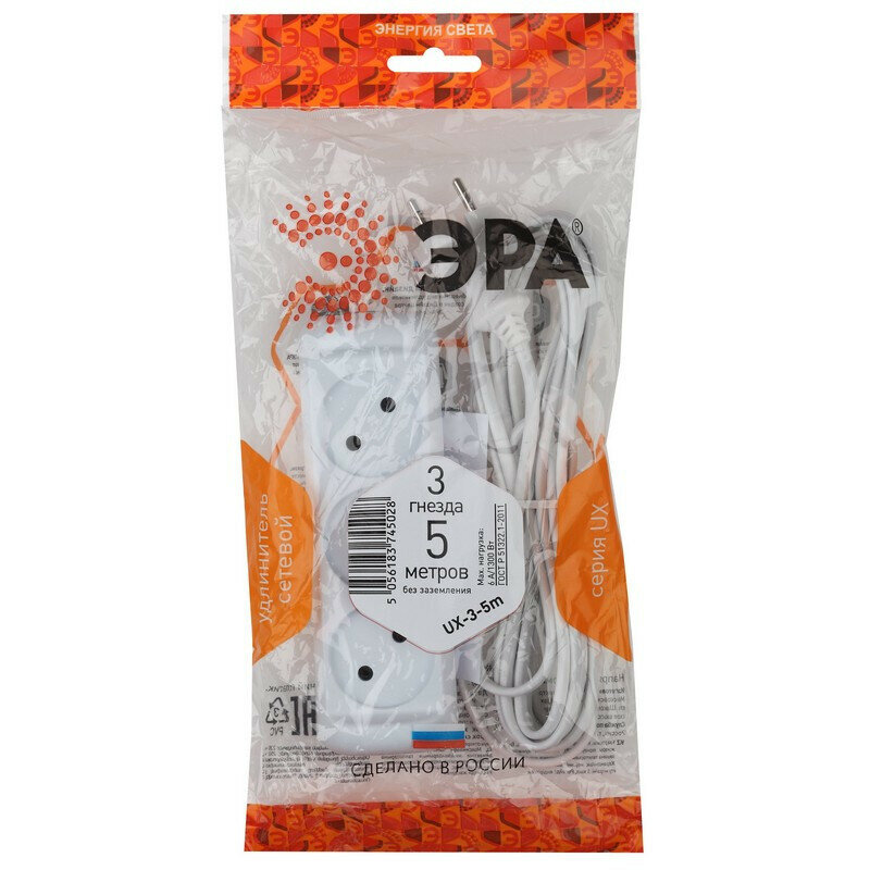 Удлинитель ЭРА, 3 роз/5м/2х0.75мм/6А/1300Вт, без заземл, белый, UX-3-5m(M)