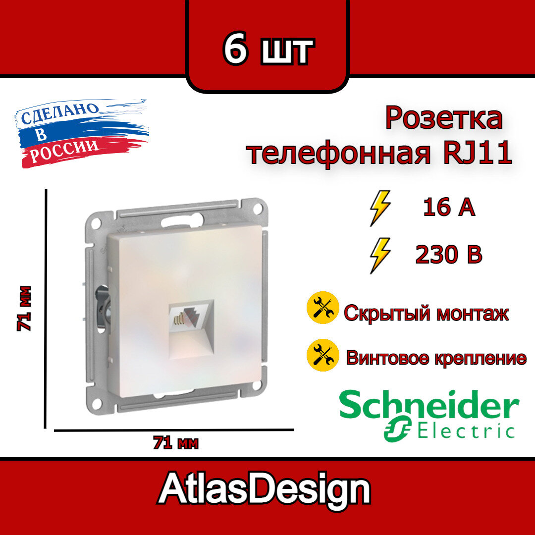 Розетка телефонная, RJ11, механизм, грифель, Schneider Electric AtlasDesign (комплект 6шт)