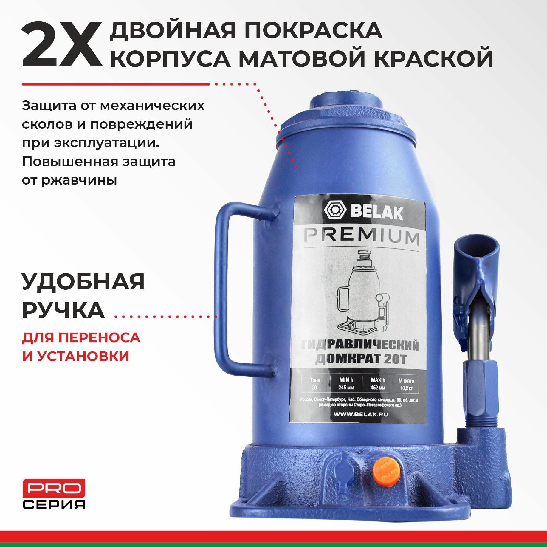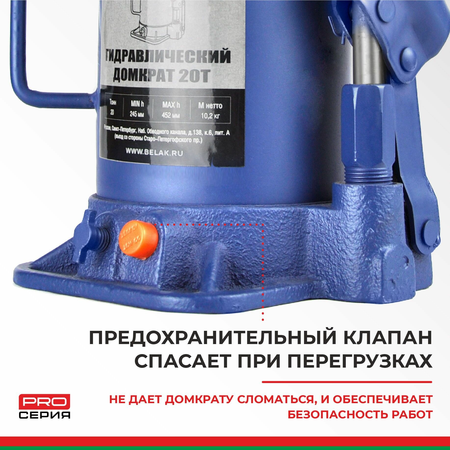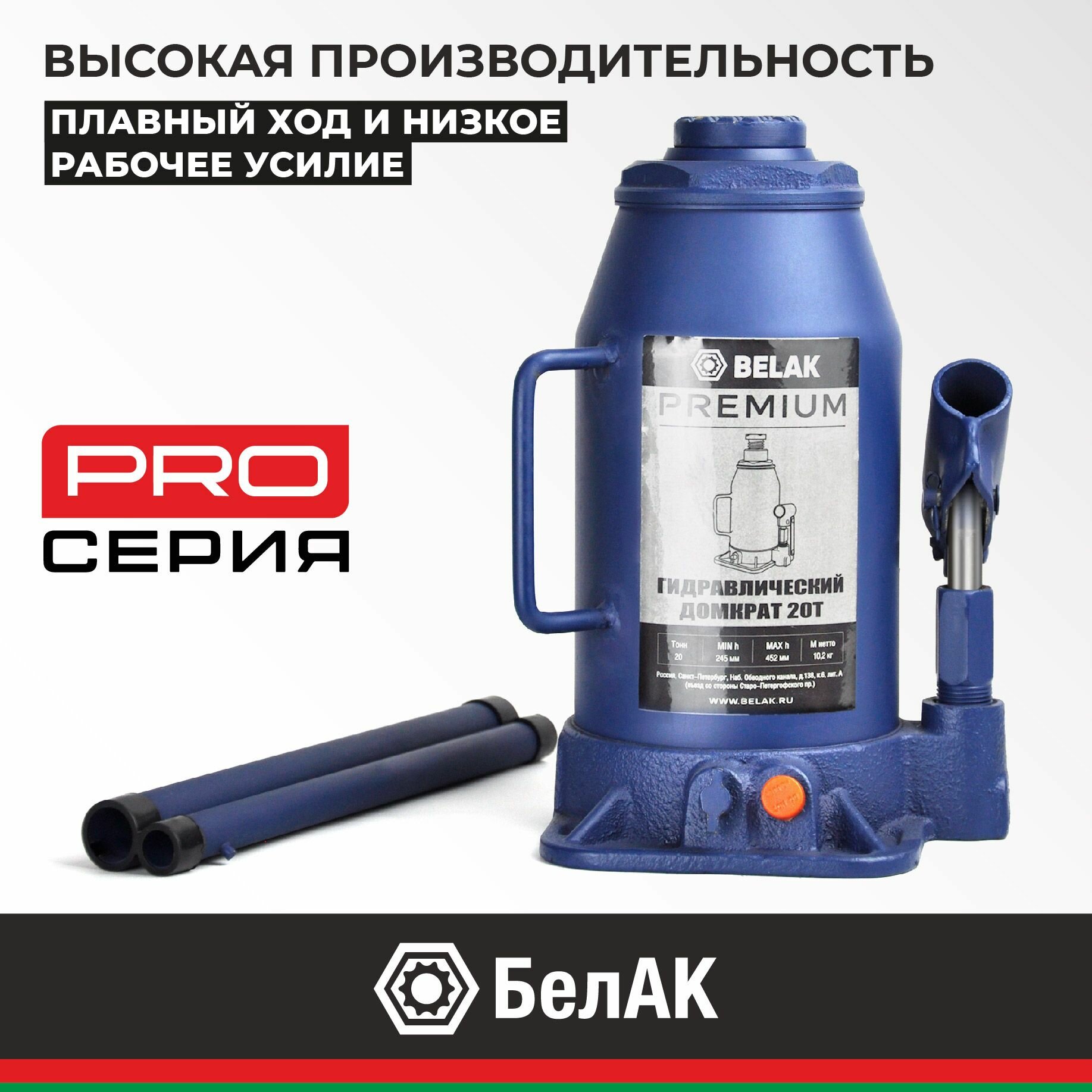 Белавтокомплект BAK.30020 Домкрат 20 тонн PREMIUM "BELAK" (TUV, 2 клапана, 245мм-452мм)
