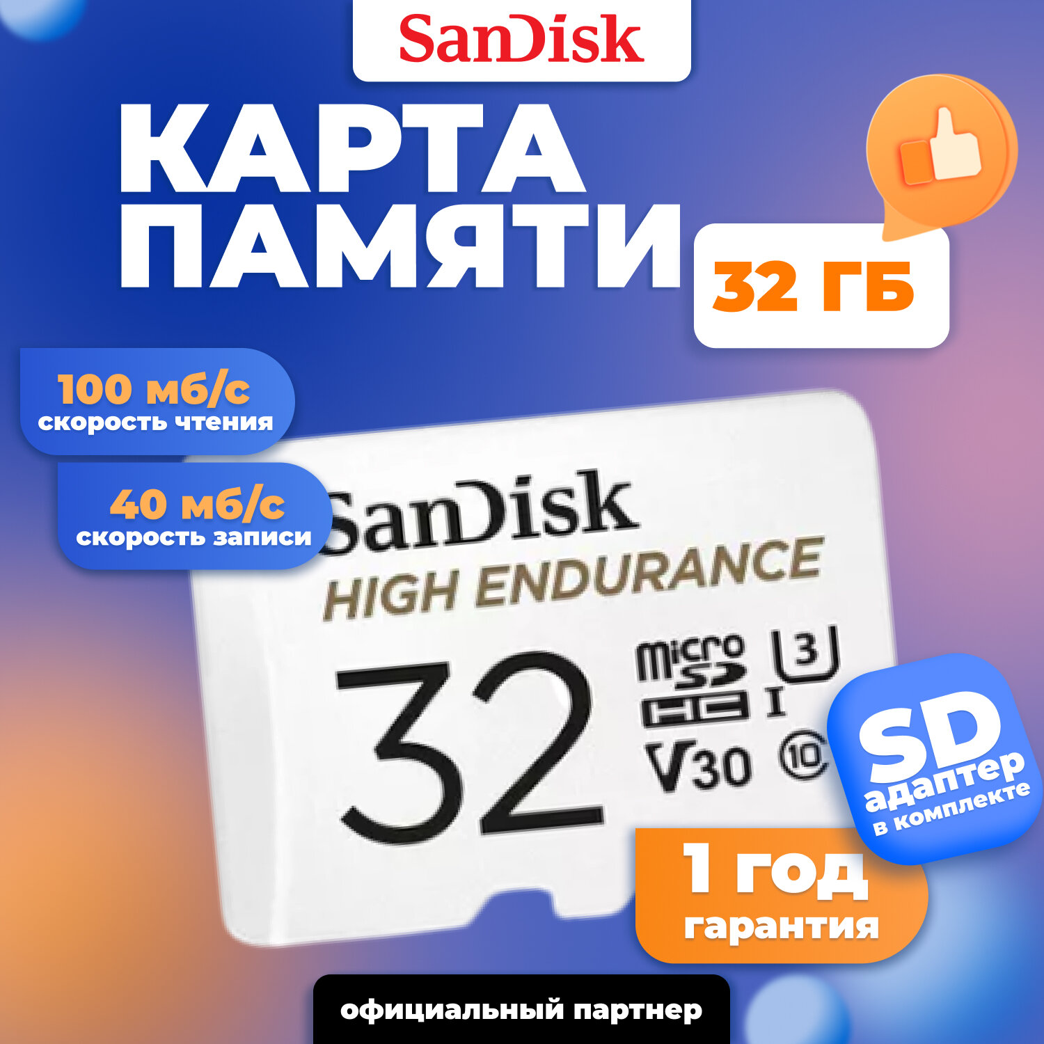 Карта памяти SanDisk "MAX ENDURANCE", microSDHC, 32ГБ, V30, Class 10, UHS-I, U3, в комплекте адаптер