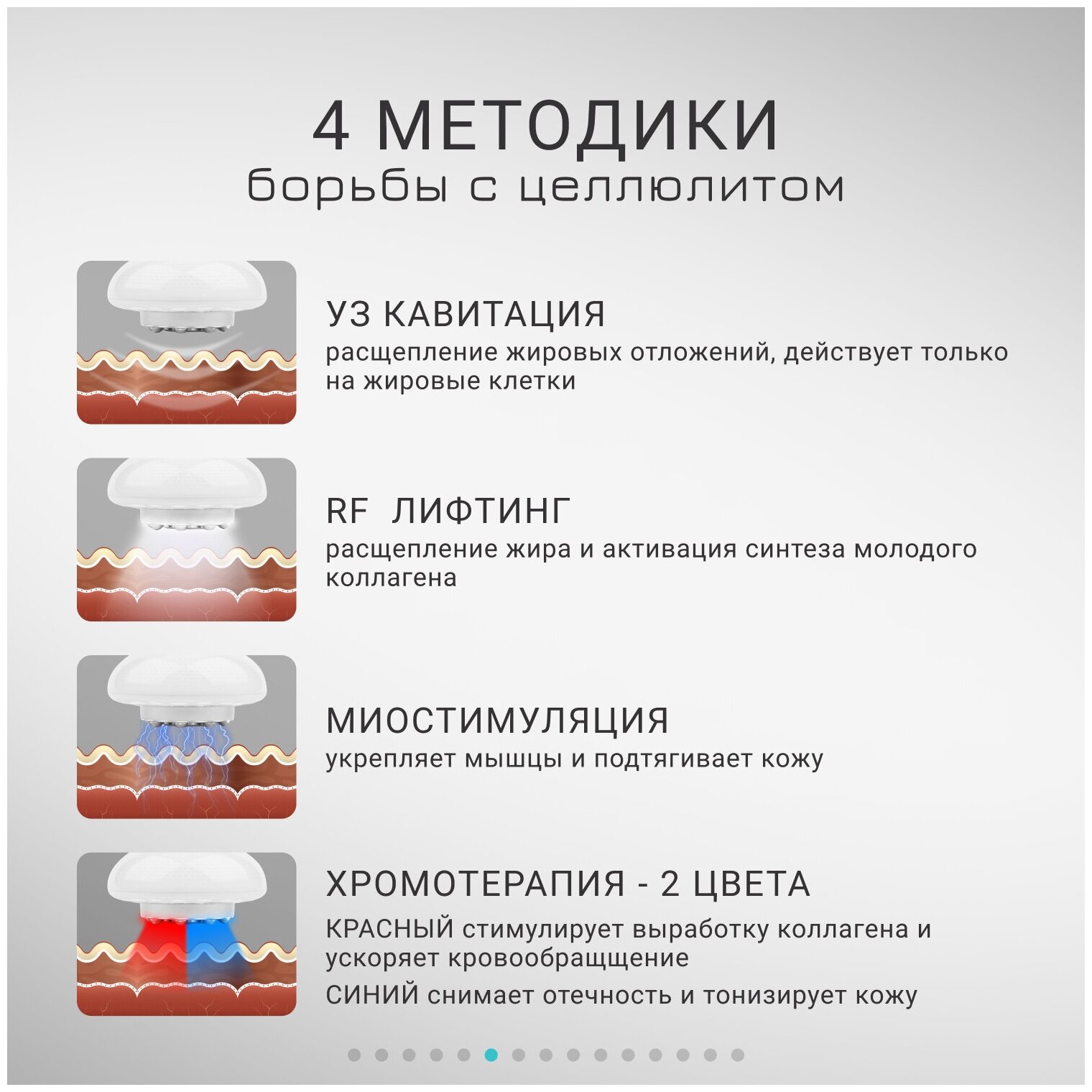 | Функции | автоотключение / инфракрасное излучение / регулировка интенсивности массажа / миостимуляция / радиочастотный лифтинг / ультразвуковая кавитация / хромотерапия |
