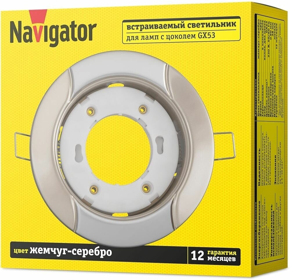 Ниже Вы можете прочитать отзывы на Светильник встраиваемый Navigator 93051 NGX-R8-001-GX53, волна жемчуг-серебро, ознакомится с подробными характеристиками, посмотреть интересные обзоры и фотографии на Светильник встраиваемый Navigator 93051 NGX-R8-001-GX53, волна жемчуг-серебро.