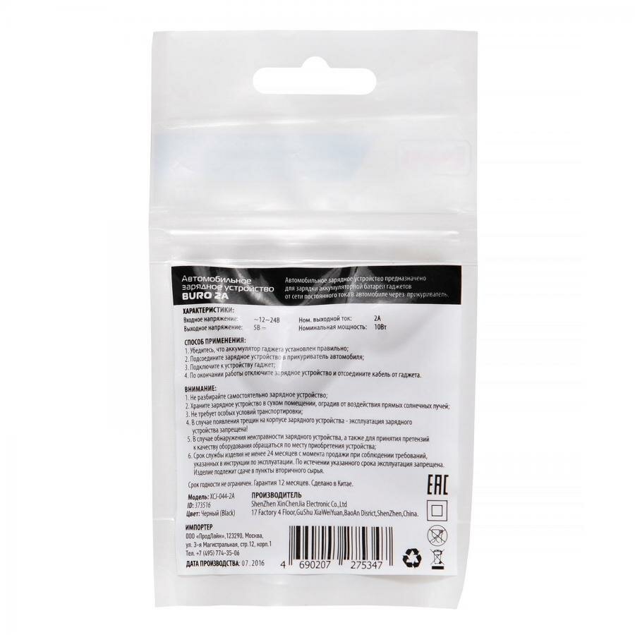 Автомобильное зарядное устройство BURO XCJ-044-2A, USB, 2A, черный
