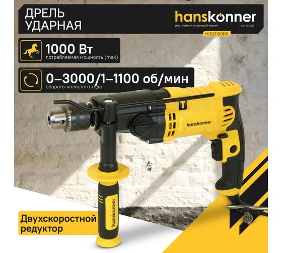 Купить Дрель ударная Hanskonner (HID21100DS), 1000 Вт, ДВЕ скорости, 0-1100/3000 оборотов, кабель 4 м