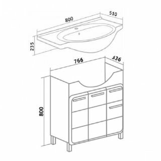 | Комплектация | 1 тумба под раковину, 1 умывальник Уют 45, 3 ручки, 4 ножки. |