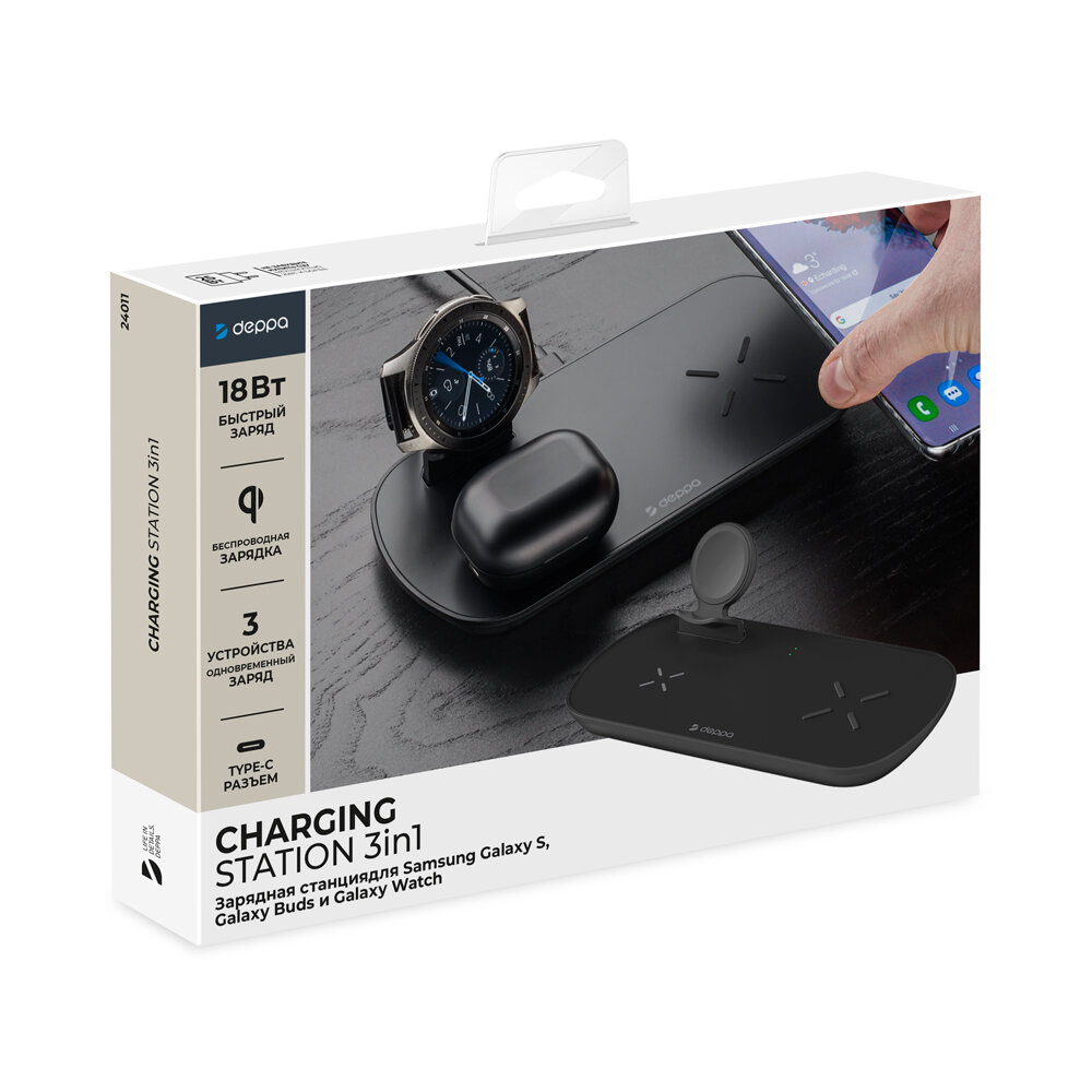 Беспроводная зарядная станция Deppa 3 в 1 Qi, Galaxy Watch, Galaxy Buds, 17.5 Вт, черная (24011)
