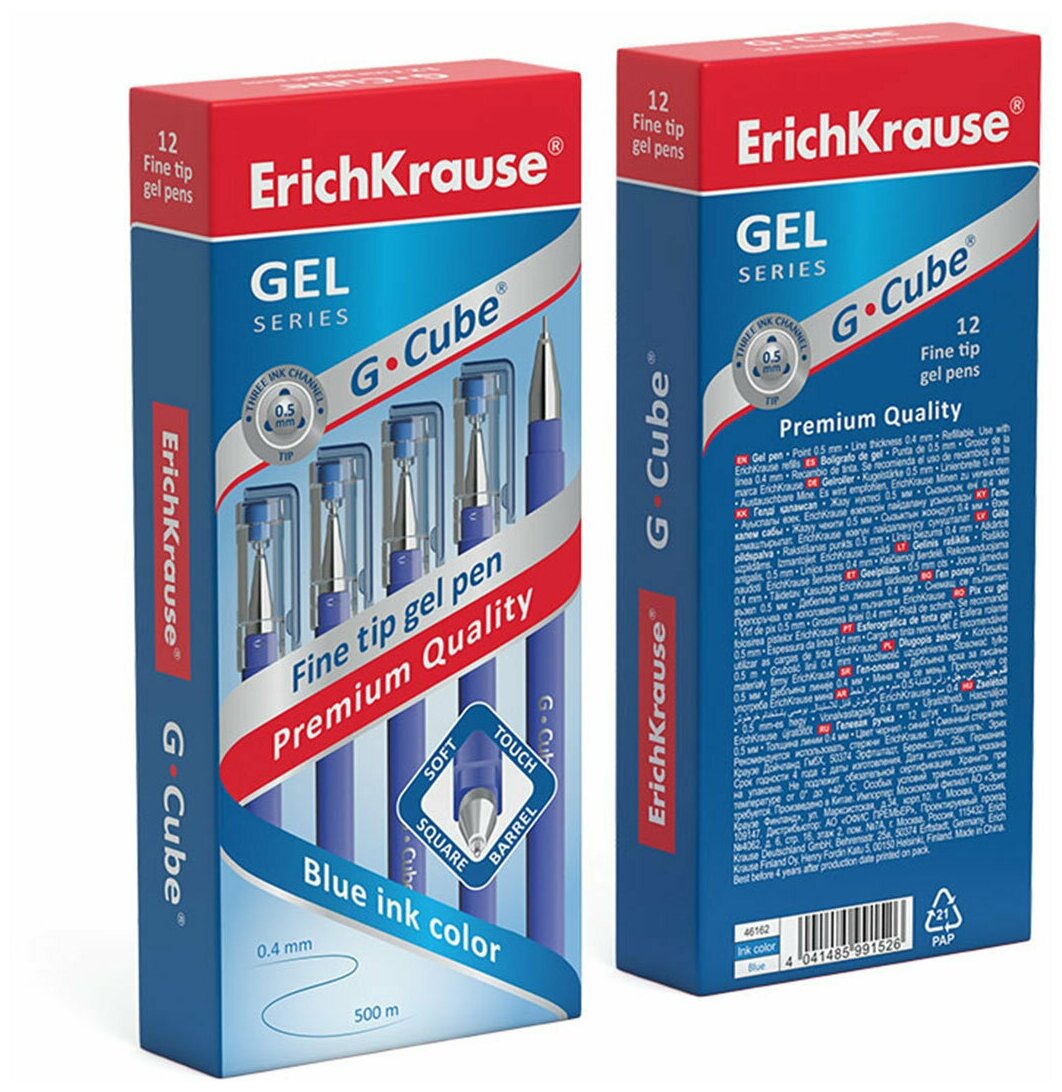 Упаковка 12 шт. Ручка гелевая ERICH KRAUSE "G-cube", синяя, корпус синий, игольчатый узел 0,5 мм, линия письма 0,4 мм, 46162
