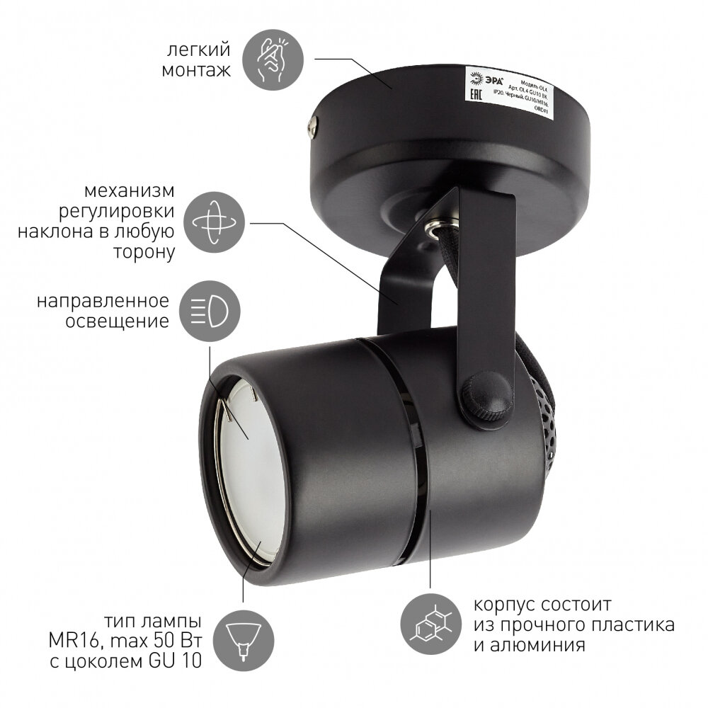 OL4 GU10 BK Подсветка ЭРА Накладной, черный