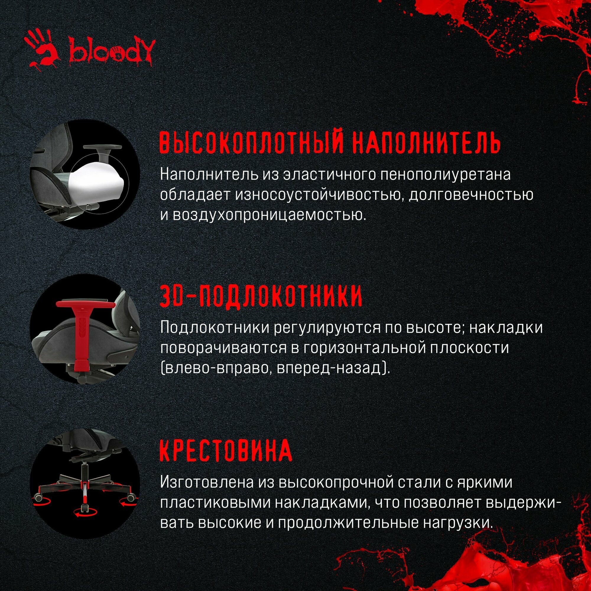 СохранитьИгровое компьютерное кресло A4Tech Bloody GC-420 на колесиках, дышащая ткань, 3D подлокотники, крестовина металл, серый интересное:
