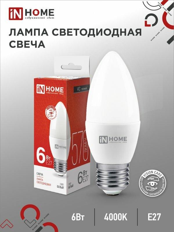 Лампа светодиодная IN HOME LED-СВЕЧА-VC 6Вт Е27 3000К 570Лм, Теплый белый свет, 10шт.