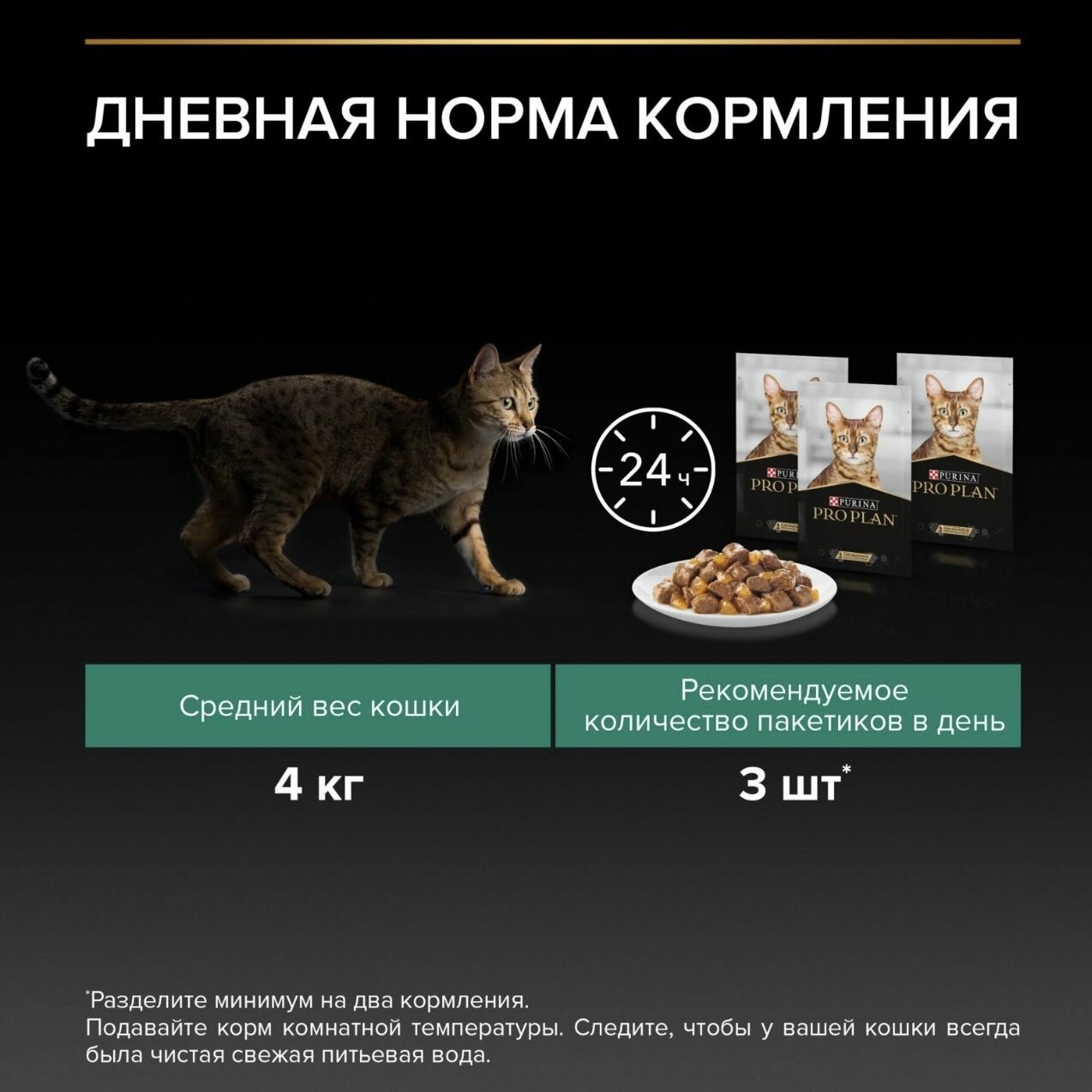 | Дополнительная информация | индивидуальные потребности кошки могут варьироваться, и ежедневное количество корма должно быть скорректировано в соответствии с необходимостью поддержания оптимального веса кошки; подавайте корм комнатной температуры; следите, чтобы у вашей кошки всегда была чистая свежая питьевая вода |