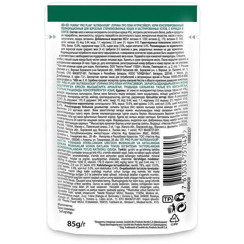 | Дополнительная информация | индивидуальные потребности кошки могут варьироваться, и ежедневное количество корма должно быть скорректировано в соответствии с необходимостью поддержания оптимального веса кошки; подавайте корм комнатной температуры; следите, чтобы у вашей кошки всегда была чистая свежая питьевая вода |